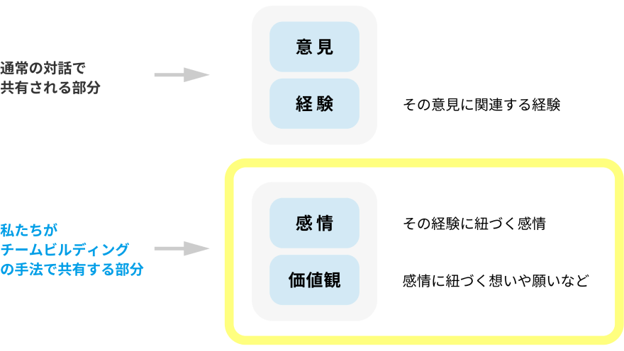 それは、意見だけを共有するのではなく、その意見の奥にある感情や価値観までも共有するチームのつながりを生む深い対話です。